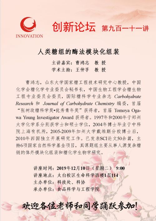 上一条:病原菌宿主专一性的分子机制—人伤寒沙门氏菌带来的启示 下一条:西北大学创新论坛第八百二十三讲暨校庆117周年学术讲座:核心岩藻糖基化修饰调节特异性免疫应答的作用机理