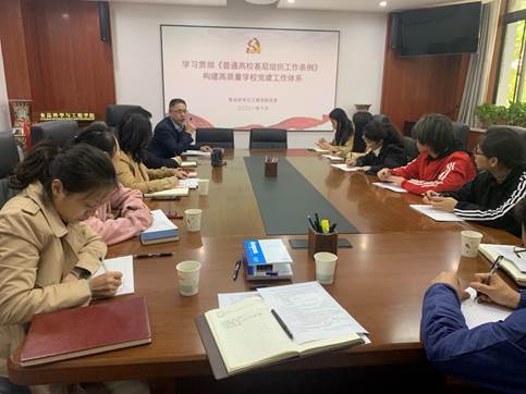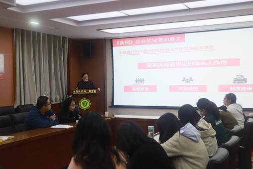 beat365在线体育官网党委书记刘晓忠以《学习贯彻<普通高校基层组织工作条例> 构建高质量学校党建工作体系》为题,详细解读了《中国共产党普通高等学校基层组织工作条例》(以下简称《条例》)。他结合日常工作实际,围绕《条例》修订的背景过程和总体考虑、框架结构和章节布局、调整完善的重点内容以及对责任落实作出的制度安排等四个方面进行了阐述,强化了大家对《条例》基本内容的全面掌握。