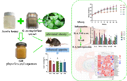 肥胖是一种与炎症和氧化应激有关的多因素代谢紊乱疾病,已成为全球关注的公共卫生问题。绞股蓝Gynostemma pentaphyllum (Thunb.) Makino是葫芦科攀缘草本,其主要活性成分是皂苷,具有减肥、降脂、抗氧化等功效,但其味苦、寒凉难以作为长期膳食补充剂被利用。蜂蜜是蜜蜂采集植物的花蜜、分泌物或蜜露,与自身的分泌物混合酿制成的天然甜物质,其味甘,平,具有补中,润燥,解毒功效,可调和百草,故可缓解绞股蓝的苦涩味,且蜂蜜中的酚类等活性成分与绞股蓝中的皂苷可能产生协同效应,以促进其吸收。本研究将绞股蓝皂苷提取物与洋槐蜂蜜混合,制备出一种具有良好适口性的功能食品—绞股蓝蜜膏(GH),其含有绞股蓝皂苷 XLIX 0.055 mg/g、绞股蓝皂苷A 0.01 mg/g和11种酚类化合物,能显著改善小鼠血脂水平,减少肝脏组织损伤和附睾脂肪细胞体积增大,调节SOD和GSH等酶活性,增强氧化应激防御能力,并通过下调IL-6(52.4%)、TNF-α(38.7%)、IFN-γ(32%)和NF-κB(28%)基因的表达发挥抗炎活性,同时重塑肠道微生物群结构,从而发挥降脂作用。更重要的是,蜂蜜能够改善绞股蓝的苦涩口感,缓解其寒凉属性,有效促进肥胖小鼠的食欲。这项研究为绞股蓝功能食品的开发提供了理论基础。