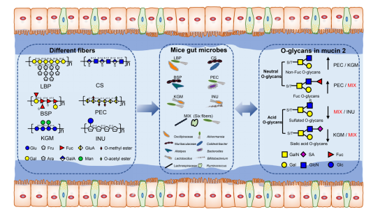 王仲孚教授团队研究了小鼠补充六种结构明确的膳食多糖(魔芋葡甘露糖、海带多糖、硫酸软骨素、枸杞阿拉伯半乳聚糖、果胶、菊粉和六种膳食多糖的混合物)后肠道微生物组成及其代谢产物(如短链脂肪酸)以及结肠粘蛋白O-聚糖的变化,发现补充膳食多糖主要通过上调中性O-聚糖来增加总O-糖链的表达量,高度分支化的阿拉伯半乳聚糖上调末端单岩藻糖基化的core 1 O-聚糖;直链多糖,包括果胶、魔芋葡甘聚糖、低聚果糖(菊粉)和多糖混合物,上调了末端双岩藻糖基化O-聚糖的表达水平,其中后三者还可下调硫酸化糖和唾液酸化O-聚糖的表达。含有阿拉伯糖的膳食多糖可显著上调A.muciniphila的丰度;硫酸化膳食多糖可上调Muribaculaceae的相对丰度。总体而言,不同的单糖组成之间具有协同增效作用,摄入单糖组成丰富的膳食多糖可能更有益于机体健康。本研究首次揭示了膳食多糖结构、粘蛋白O-聚糖组成和肠道微生物之间的关系。