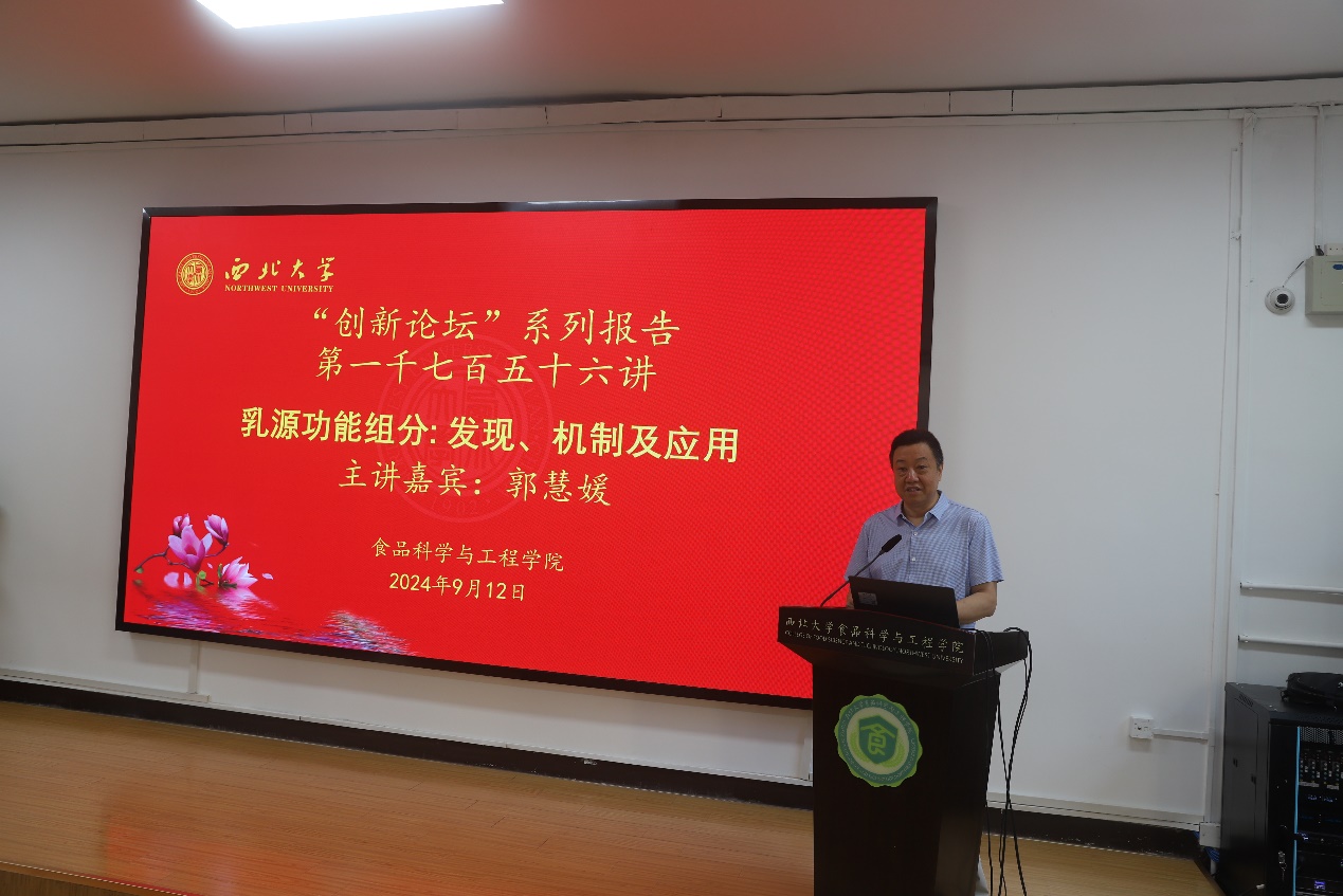 9月12日,由beat365在线体育官网科技处、科协主办,食品科学与工程学院承办的“西北大学创新论坛”第一千七百五十六讲在太白校区举行。中国农业大学郭慧媛教授应邀来校为师生做了题为“乳源功能组分: 发现、机制及应用”的报告。beat365在线体育官网相关专业师生代表参加了报告会。报告会由岳田利院长主持。