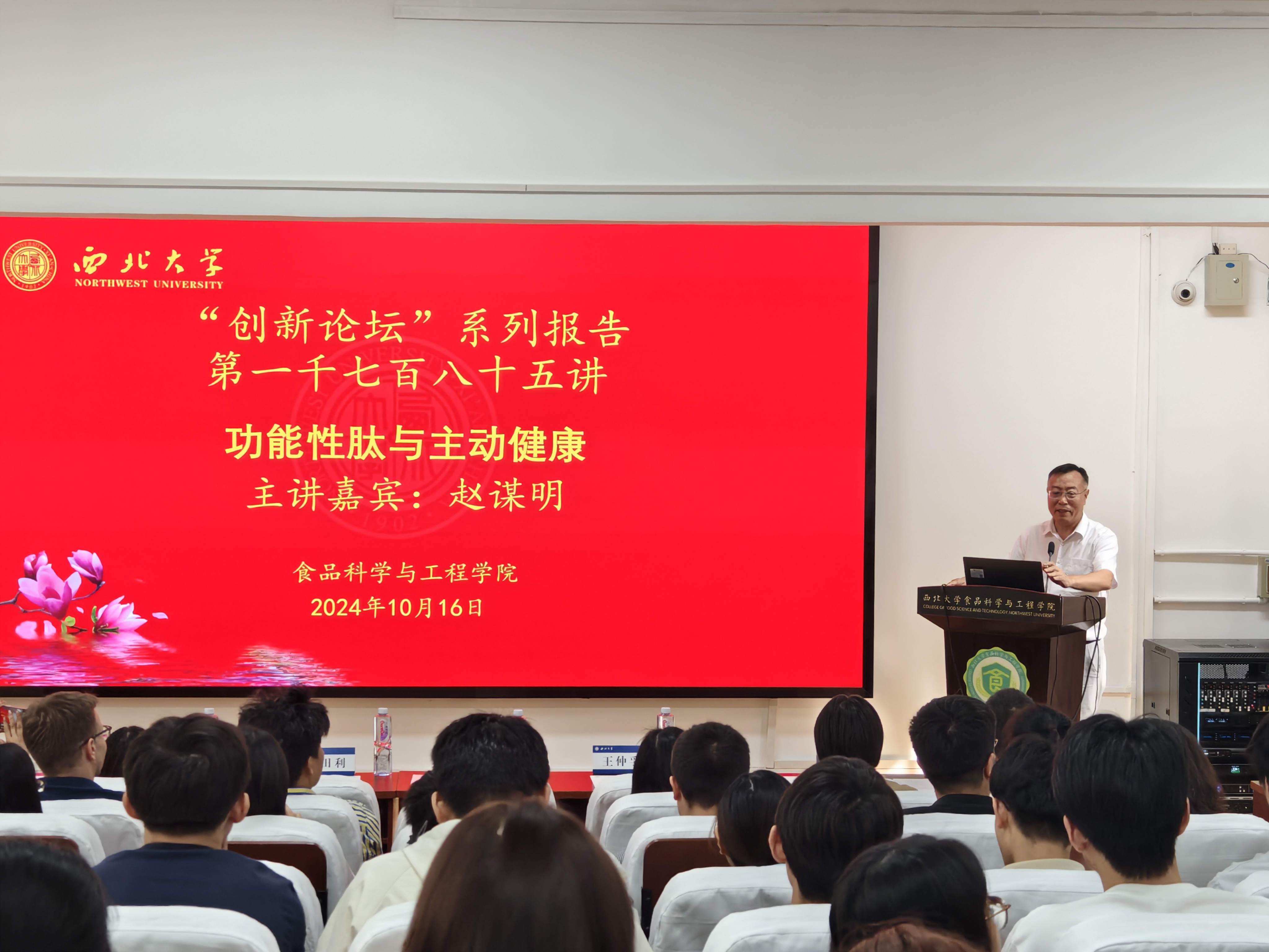 10月16日,由beat365在线体育官网科技处、科协主办,食品科学与工程学院承办的“西北大学创新论坛”第一千七百八十五讲在太白校区举行。华南理工大学赵谋明教授应邀来校为师生做了题为“功能性肽与主动健康”的报告。beat365在线体育官网相关专业师生代表参加了报告会。报告会由王仲孚副院长主持。