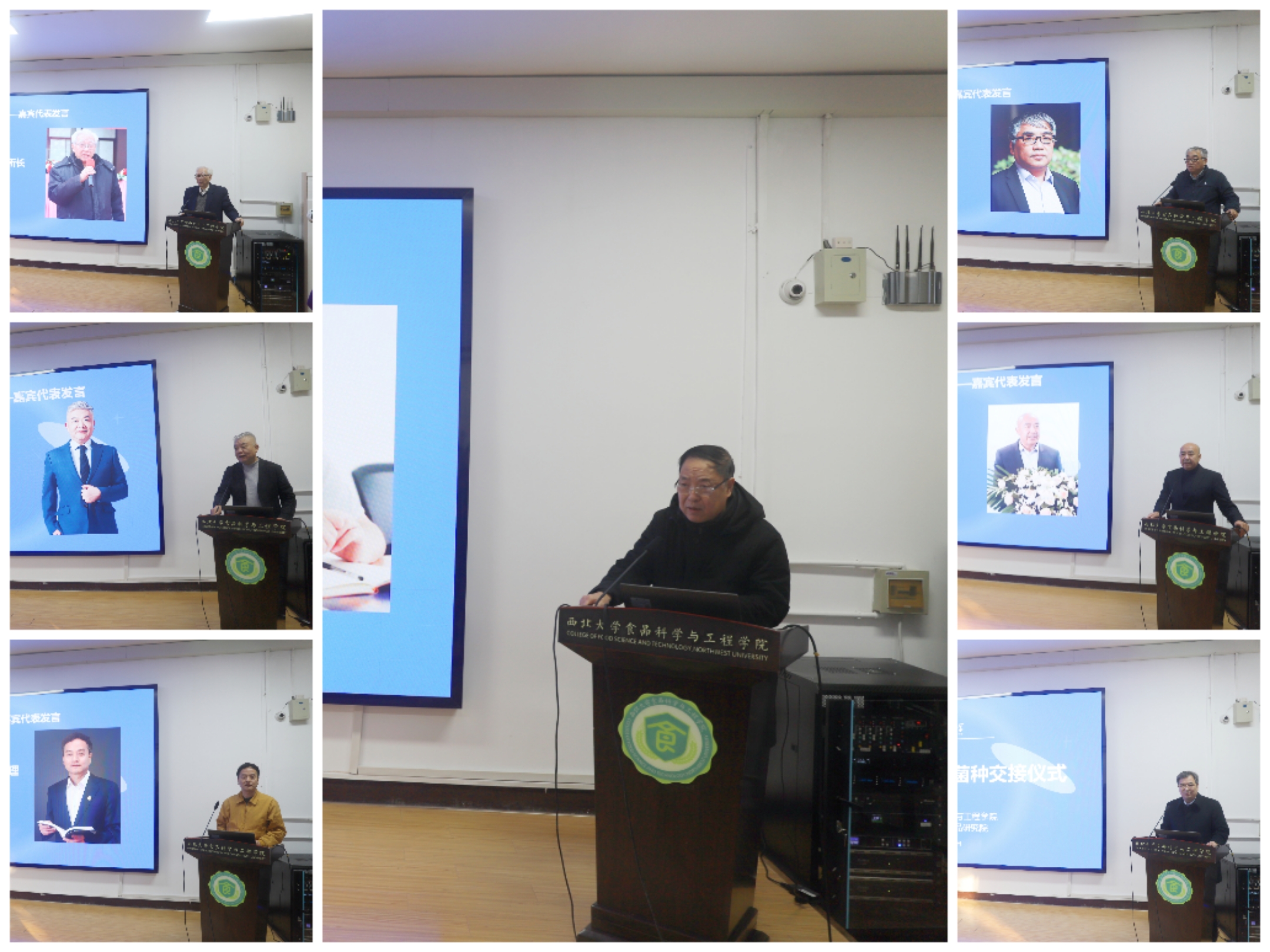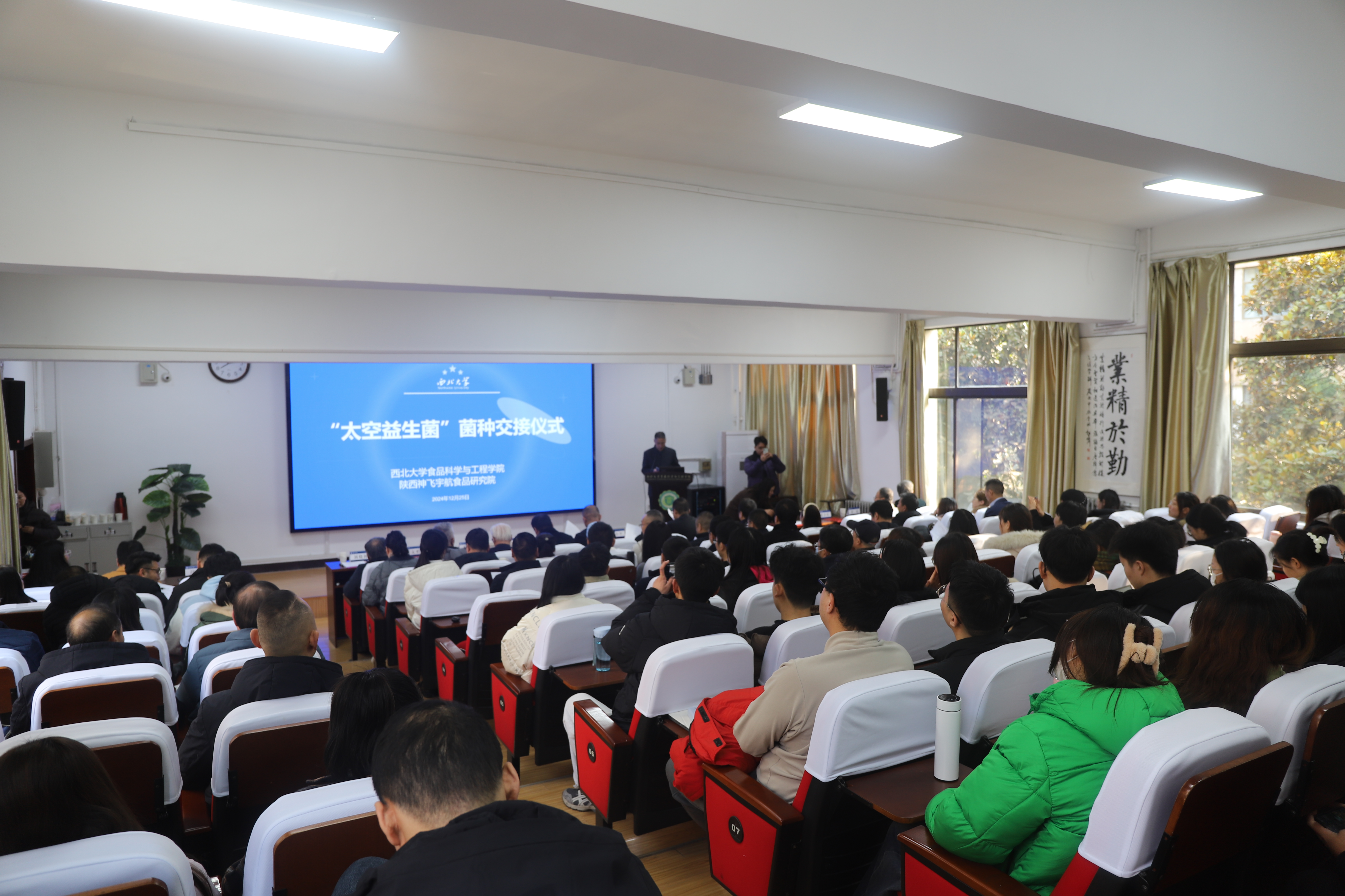 12月25日下午,食品科学与工程学院与北京神飞航天应用技术研究院在西北大学太白校区食品科学与工程学院院楼举行“太空益生菌”菌种交接仪式,出席本次大会的主要领导有西北大学党委常委、副校长陈富林,中国食品工业协会副会长林小平,陕西省农业厅原厅长、西北大学生态毒理研究所所长史志诚、北京神飞航天应用技术研究院常务副院长毛宏伟,以及陕西省餐饮联合会会长靳文平、陕西面食产业促进会会长刘晓钟、陕西西凤酒股份有限公司研发中心主任金成勇、西安饮食集团总经理冯凯、西安冰峰饮料股份有限公司总经理姚军锋、泾河新城茯茶文化产业园发展中心副主任王洋等省内外30余家行业协会及著名食品企业主要负责人、中国食品报、华商网等知名媒体和学校相关科室负责人,食品科学与工程学院师生代表80余人参加了交接大会。