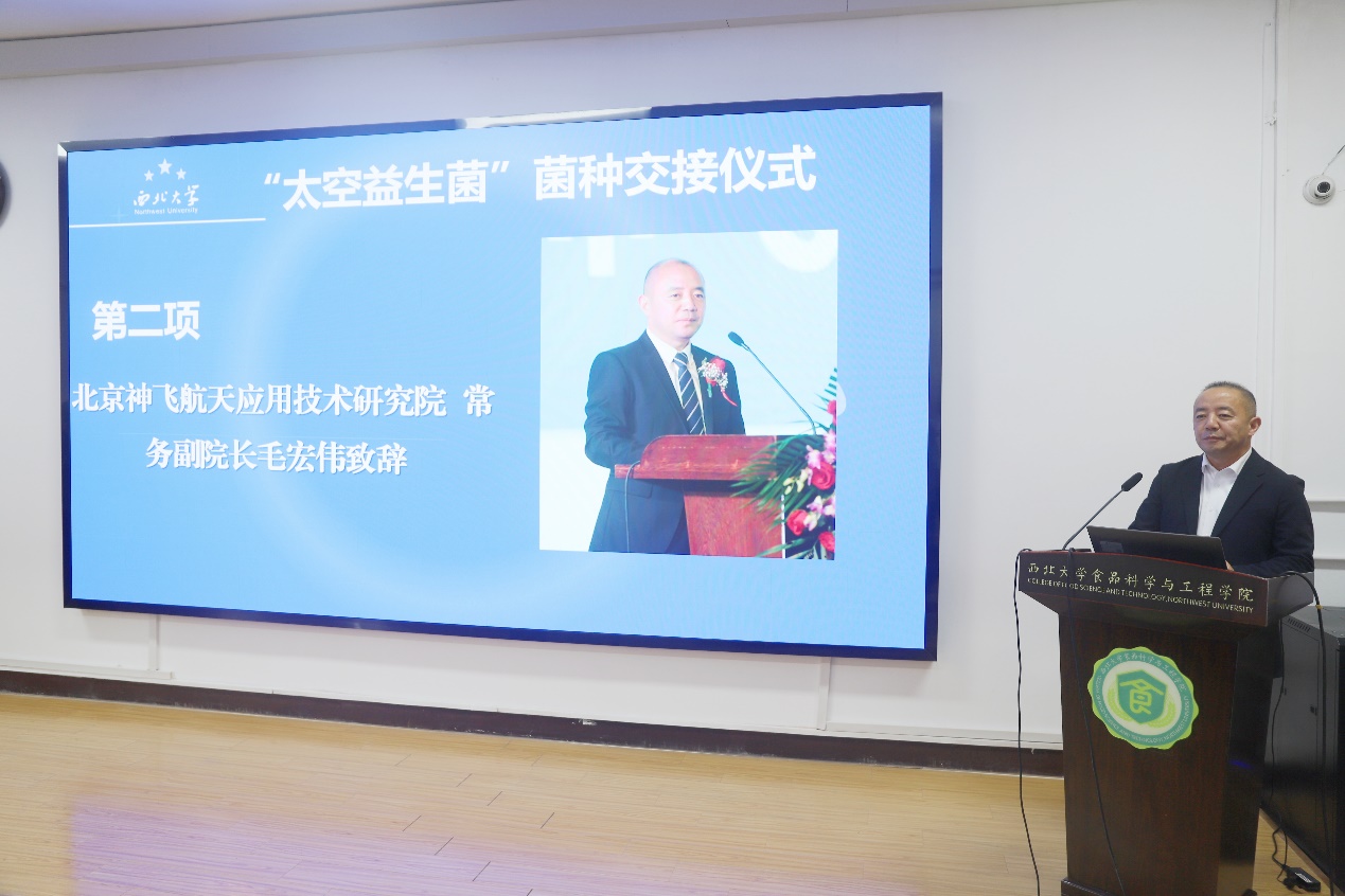 陈富林在致辞中介绍了学校情况,他强调近年来,学校积极践行“健康中国”战略,锚定西部食品领域“人才培养中心”“技术创新中心”和“成果转化中心”的办学定位,成立了食品科学与工程学院。在全院师生的努力下, “2024软科中国大学专业排名”中食品科学与工程专业获评A级、进入全国最好食品专业前50名。食品科学与工程学科进入软科世界一流学科榜单,以食品科学与工程学科为核心支撑的农业学科进入ESI全球前1%。学院已在食品科学领域产生了广泛的学术影响和社会影响力。特别是与北京神飞航天应用技术研究院开展紧密合作,联合组建了陕西宇航食品研究院专家委员会,beat365在线体育官网岳田利教授团队还参与了北京神飞航天应用技术研究院牵头的团体标准“宇航级食品生产企业通用技术规范”的编制,共创产学研合作共赢新局面。今天,举行的交接仪式,既是对我们双方合作阶段性的一个总结,同时,也将是一个崭新阶段的开始。这些宝贵的菌株具有重大的科学价值与极为广阔的市场应用前景。后期,希望双方在共建的研究平台上,利用相关研究成果,制定该领域行业标准、技术规范,并积极为食品企业产品开发创新工作服务,不断为企业的发展注入新的活力和源泉,创造更多的经济和营养价值,造福于民,造富于国。