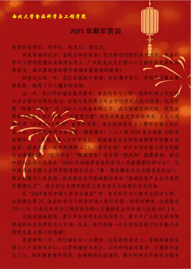 beat365在线体育官网成立于2017年,是在2002年成立的西北大学化工学院食品工程系的基础上,汇集西北农林科技大学食品科学与工程、西北大学食品科学与工程、生命科学等相关专业的师资力量组建而成。学院现有二级学科博士点1个,一级学科硕士点1个,二级学科硕士点1个。 学院现有专职教师45人,其中教授9人,副教授21人,讲师15人,100%的教师具有博士学位,80%的教师有海外留学经历。教师队伍中有原国务院学位委员会学科评议组专家1人,享受国务院特殊津贴专家1人,教育部新世纪人才2人,陕西省“三五”人才1人,陕西省科技创新领军人才2人和陕西青年科技奖获得者2人。学院拥有“朱蓓薇院士工作站”、“陕西省食品安全风险识别控制技术研究中心”、“陕西省营养健康食品个性制造工程实验室”、“陕西省食品安全与营养健康创新转化平台”和“陕西省蜂产品工程技术研究中心”、“陕西省天然多糖资源利用工程研究中心”等科研平台...