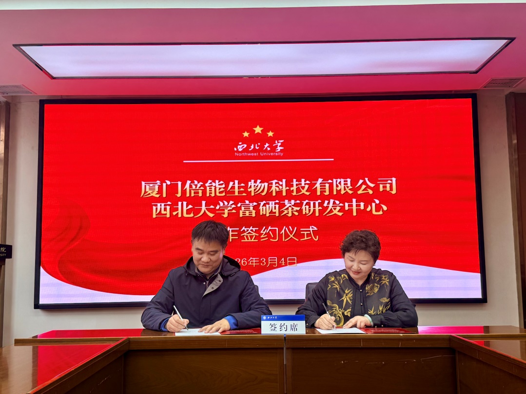 2026年3月4日,厦门倍能生物科技有限公司与西北大学富硒茶研发中心合作签约仪式在beat365在线体育官网顺利举行。厦门倍能生物科技有限公司创始人蔡福带、西北大学富硒茶研发中心主任袁亚宏教授及团队骨干共同出席活动。双方围绕功能食品研发、营养健康产品创新及科技成果转化等领域达成全面合作,开启校企协同创新、科技赋能产业升级的新征程。