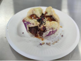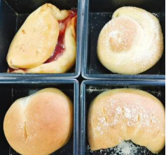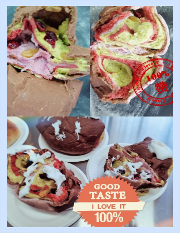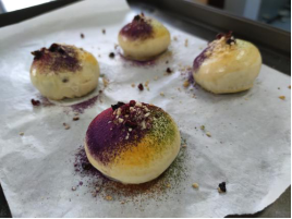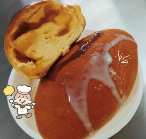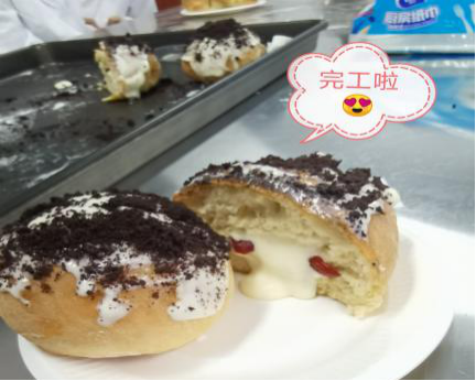 将黄桃酸奶调制秘制流心注入刚出炉的面包,加奥利奥、花生、果干作为点缀,作品由松软的面包、酸甜的果干和甜蜜的流心搭配而成,风味协调而独特,尝过的人都赞不绝口。