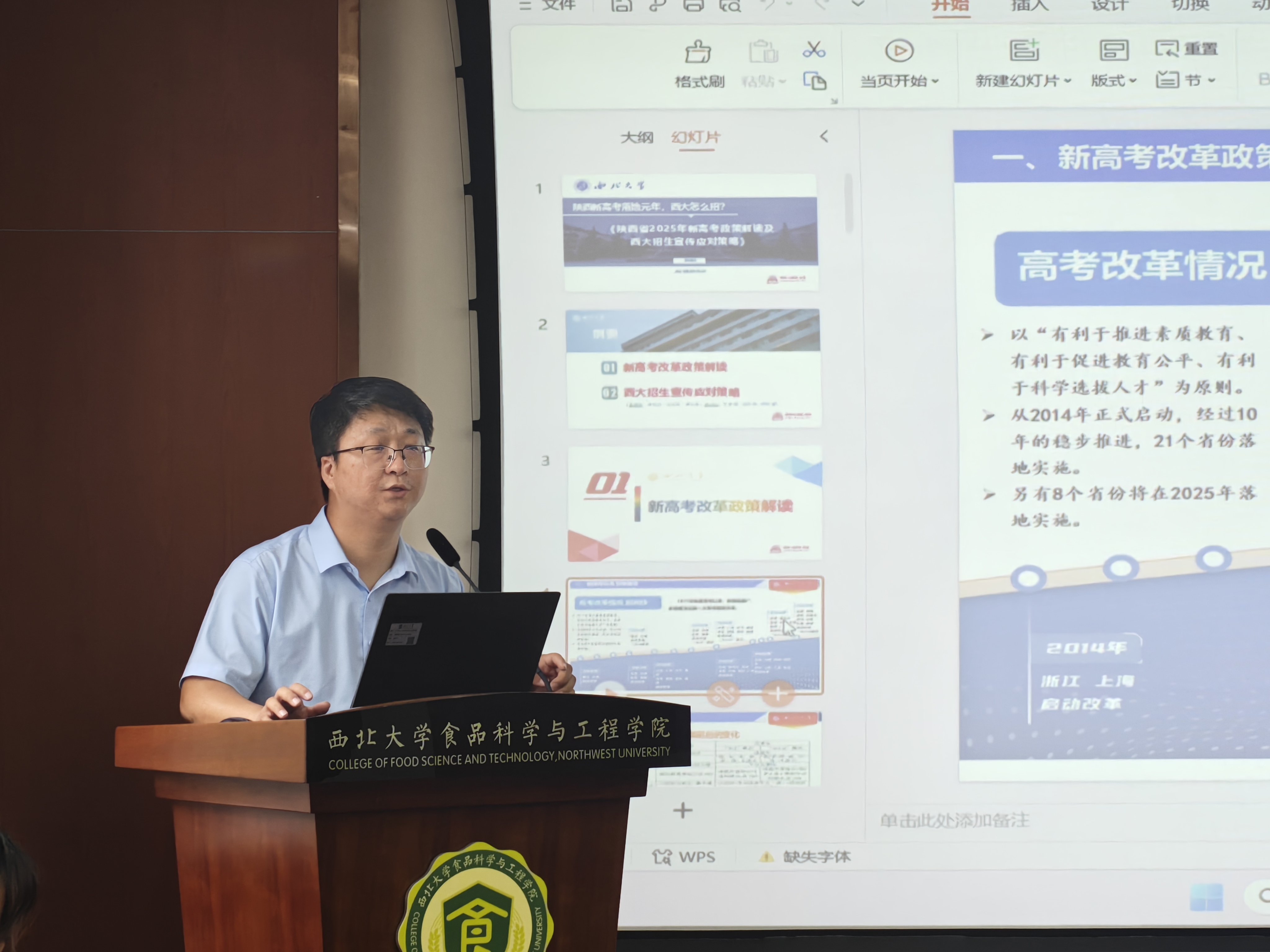 在解读西北大学招生政策环节,郑战伟主任详细介绍了学校 2025 年的招生计划、专业设置以及录取规则。着重讲解了平行志愿的投档原则以及学校在专业录取时对考生成绩、单科成绩和体检情况的具体要求,让教职工们对招生录取流程有了清晰的认识。