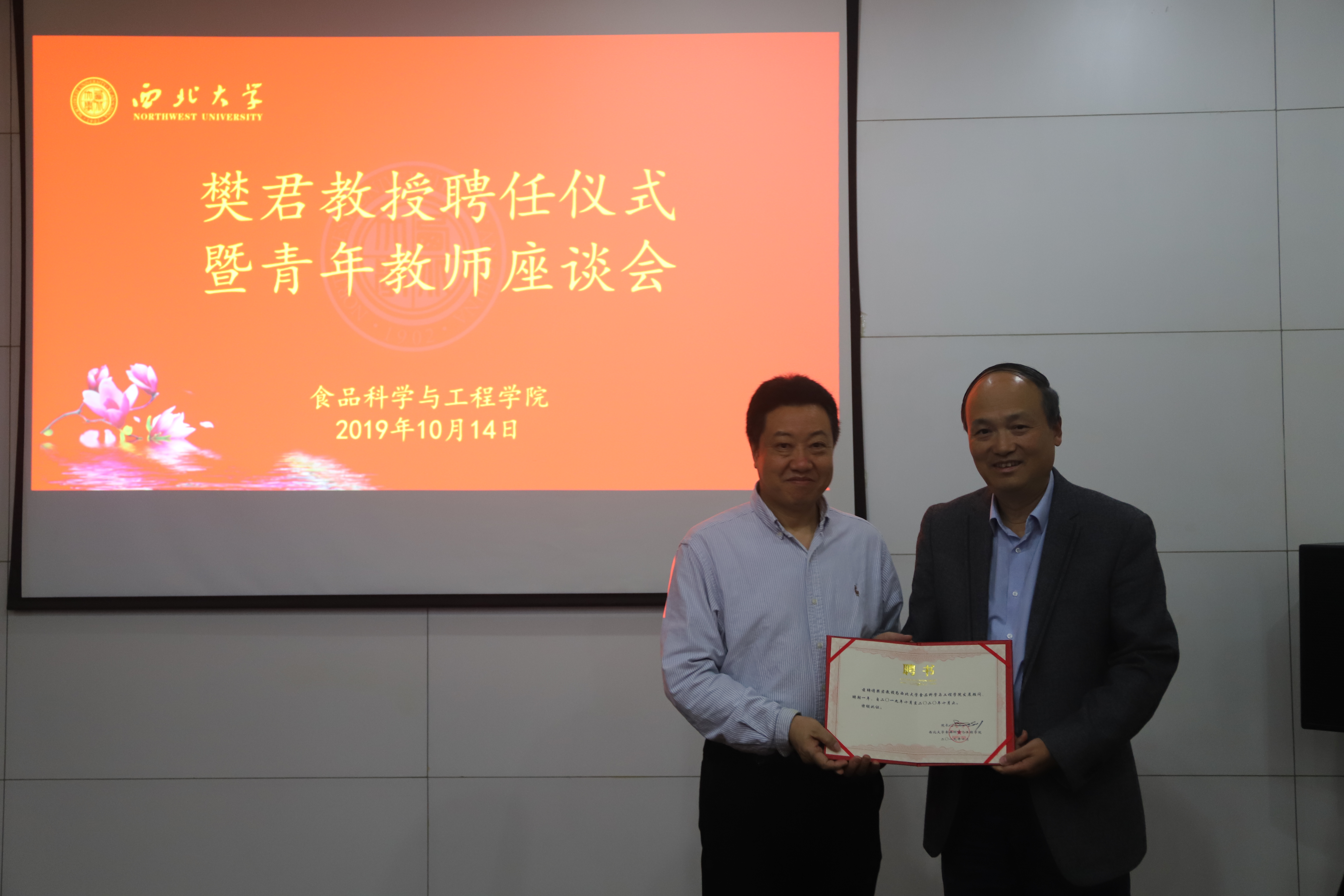 10月14日下午,beat365在线体育官网举行樊君教授聘任仪式暨青年教师座谈会,全院教师参加,会议由副院长赵会武主持。