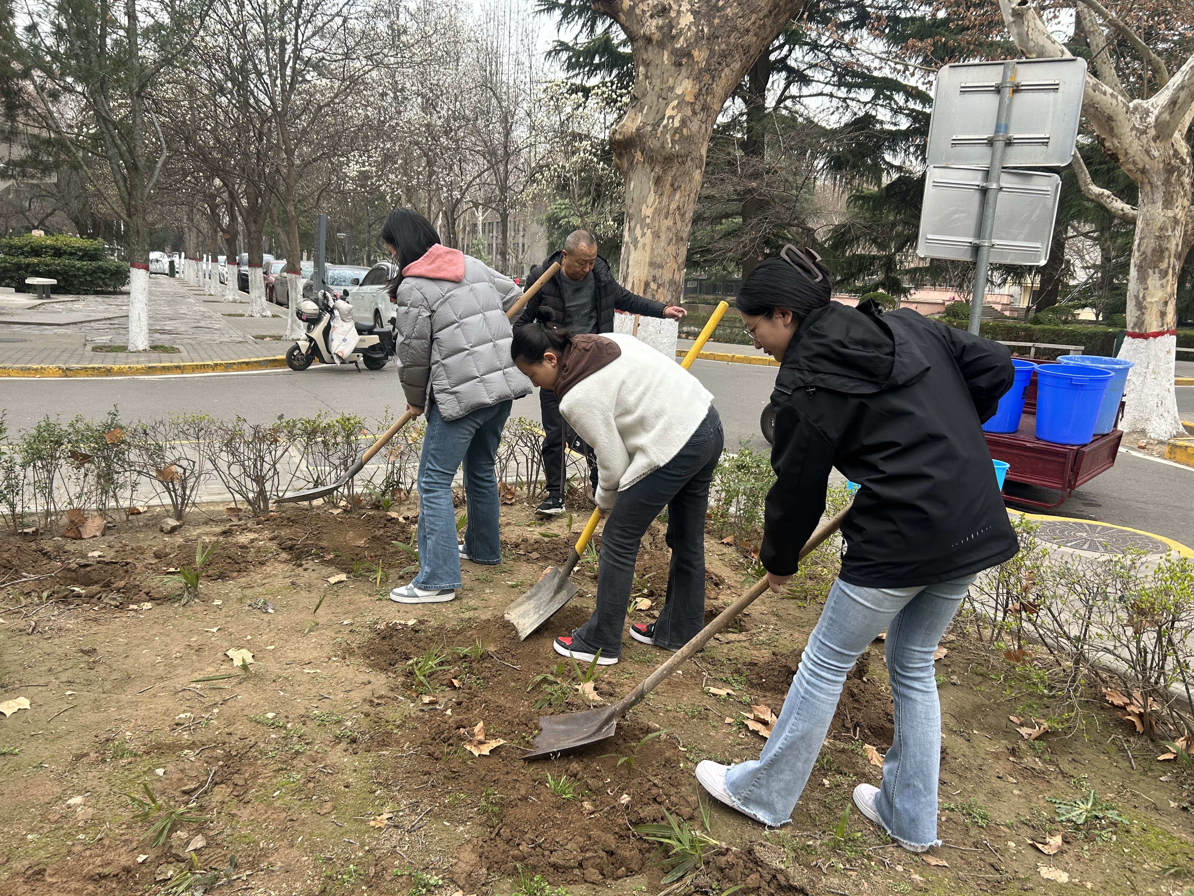 师生共同在太白校区为实际寺广场花园补种苗木,绿化校园。活动开始后,在技术人员的指导下,师生分工协作、干劲十足,挥锹铲土、放苗、填坑、提水浇灌,每个环节都衔接有序、配合默契,现场一片热火朝天的劳动景象。