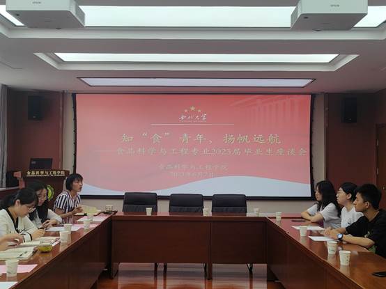 为进一步加强与毕业生的交流,倾听了解毕业生建议,6月7日上午,学院在六号楼303会议室召开主题为“知食青年、扬帆起航”的2023届毕业生座谈会。学院党委书记刘晓忠、副书记张霄、教师代表高慧教授、毕业班班主任、辅导员郭森、高会洲、周炳莹、教务管理老师刘清清、马天琛及2023届本科毕业生参加会议。会议由党委副书记张霄主持。