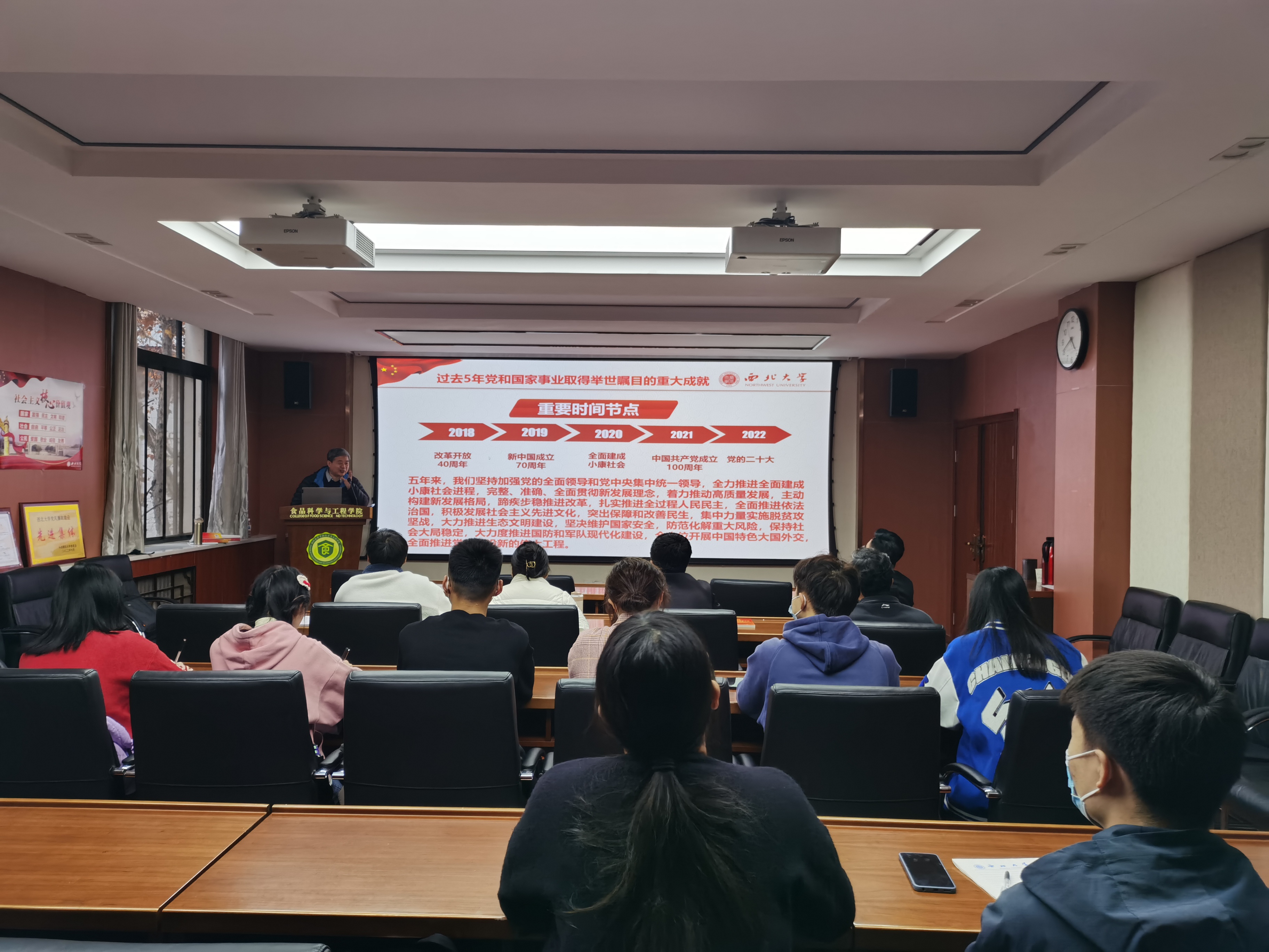 11月24日,学院党委理论学习中心组召开党的二十大精神专题学习(扩大)会,邀请校党的二十大精神宣讲团成员、马克思主义学院陈中奇教授作《团结汇聚力量 奋斗再谱华章》辅导报告。学院党政班子成员、党委委员、工会主席、科级干部、党支部书记和委员、学生工作干部和学生骨干等参加会议。会议由学院党委有关负责人主持。