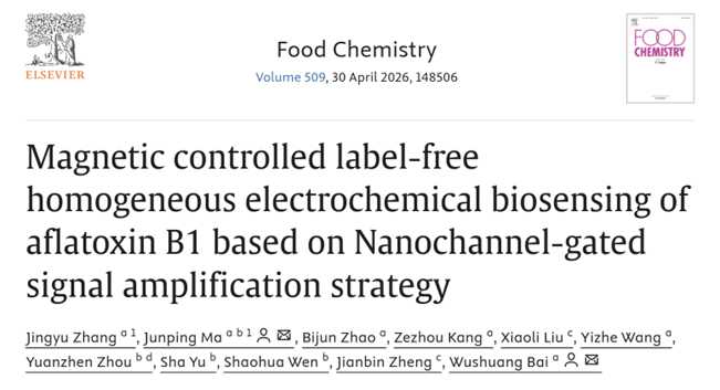 近日,beat365在线体育官网白武双副教授课题组在国际食品Top期刊《Food Chemistry》(中科院1区,IF: 9.8)发表题为“Magnetic controlled label-free homogeneous electrochemical biosensing of aflatoxin B1 based on Nanochannel-gated signal amplification strategy”的研究型论文。beat365在线体育官网在读硕士研究生张靖瑜为第一作者,通讯作者为beat365在线体育官网副教授白武双和博士研究生马军平(已毕业,现为西安建筑科技大学准聘副教授)。