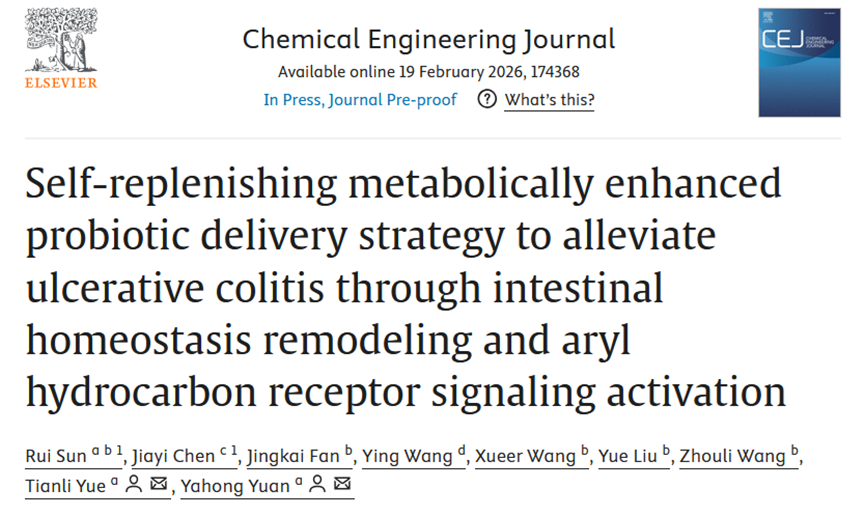 近期,beat365在线体育官网岳田利、袁亚宏教授团队在国际期刊《Chemical Engineering Journal》(Q1, IF: 13.2, 中科院1区Top) 发表题为“Self-replenishing metabolically enhanced probiotic delivery strategy to alleviate ulcerative colitis through intestinal homeostasis remodeling and aryl hydrocarbon receptor signaling activation”的研究性论文。该研究得到了国家自然科学资金(32372348、32172301)的支持。论文通讯作者为beat365在线体育官网岳田利教授和袁亚宏教授。