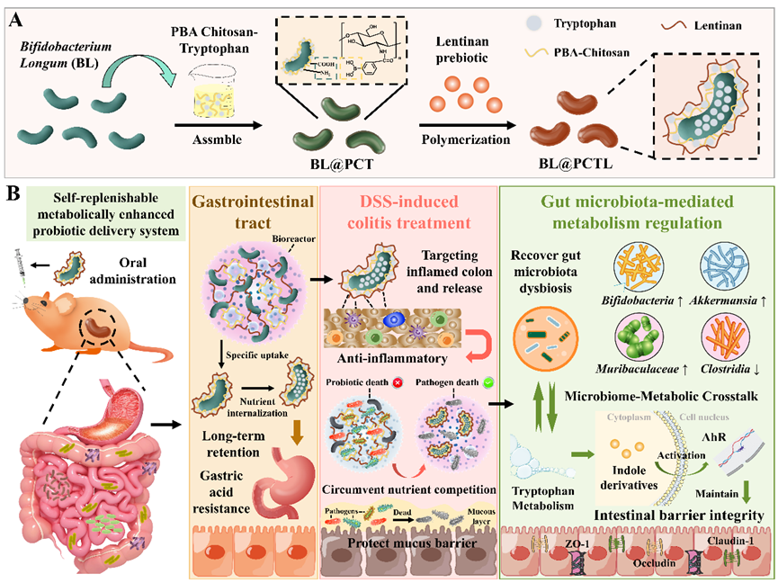 溃疡性结肠炎(UC)主要表现为肠道菌群失调、代谢功能障碍和肠道屏障损伤,但目前缺乏针对于肠道稳态重塑和代谢调节的益生菌疗法。为此,本研究开发了一种由长双歧杆菌、色氨酸营养背包和香菇多糖益生元盔甲组成的自供给代谢强化型益生菌递送系统(BL@PCTL)用于缓解结肠炎症状。自营养递送系统能够确保益生菌与营养素持续接触,延长食品加工过程中益生菌的摄取窗口,从而增强益生菌携带的营养背包和益生元在肠道中的保留,以减少有害肠道微生物对专有营养素的摄入。秦巴山地区特有的香菇多糖可有效降低益生菌对环境压力的敏感性,为其提供额外的碳源,并促进短链脂肪酸和吲哚化合物的生成。本研究充分贯彻健康食品制造的理念,将自营养背包预结合于益生菌表面,使益生菌能够原位摄取色氨酸和益生元,从而有效规避营养竞争。益生元盔甲赋予益生菌极佳的胃肠耐受性,促进其正常和炎症结肠中的长期保留。同时,益生菌可以利用营养背包作为生物反应器,增强其在炎症微环境中的活力、靶向性和定殖。BL@PCTL很好地缓解了小鼠的结肠炎症状,其核心优势在于通过肠道菌群介导的代谢调节重塑肠道稳态。具体来说,它通过增加肠道有益菌的相对丰度,刺激色氨酸转化为吲哚类衍生物,激活芳基烃受体AhR信号通路,诱导IL-22的产生,从而实现肠道屏障修复和抗炎组织修复效果。因此,本研究所开发的自供给代谢强化型益生菌递送体系在材料设计中引入了合生元的概念,并利用多组学联合分析揭示了各材料的作用机制,这些有望为炎症性肠病的治疗提供新的研究视角。