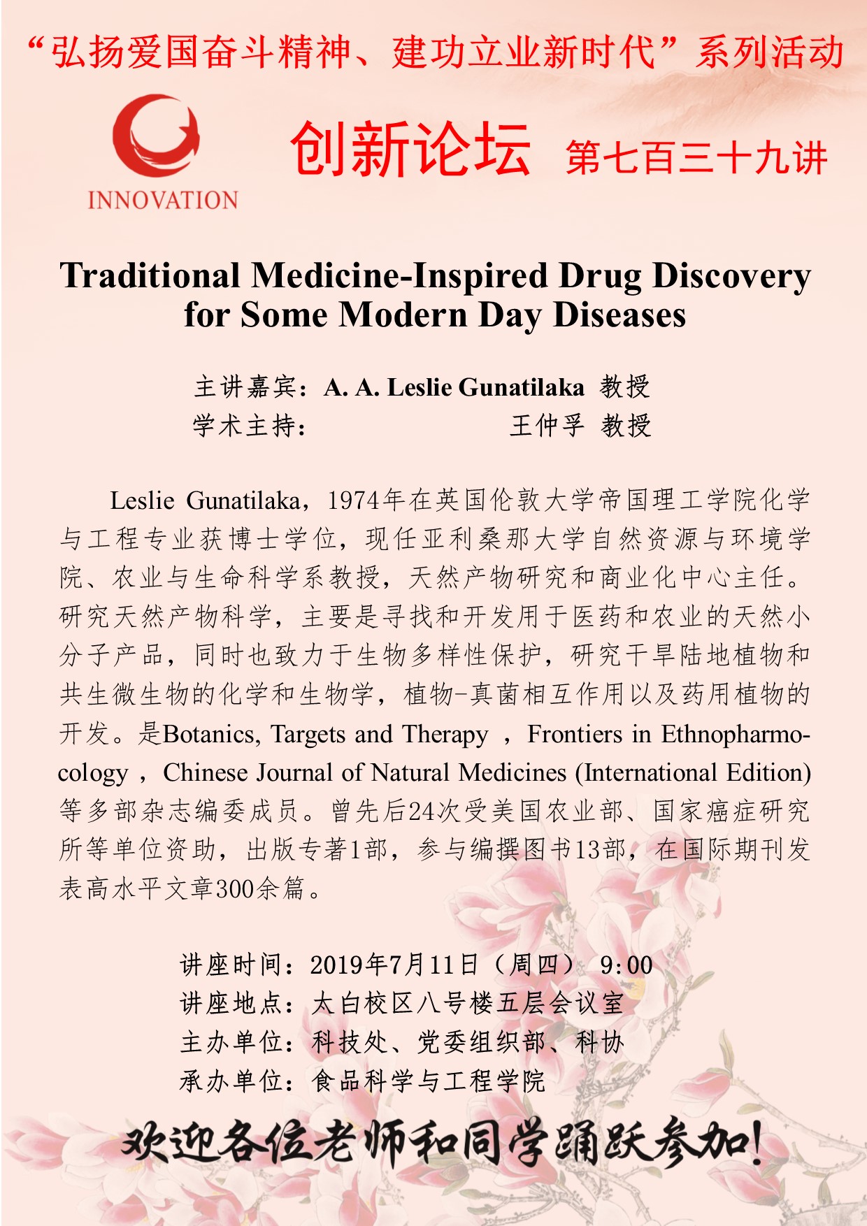 西北大学创新论坛第七百三十九讲(“弘扬爱国奋斗精神、建功立业新时代”系列活动):Traditional Medicine-Inspired Drug Discovery for Some Modern Day Diseases