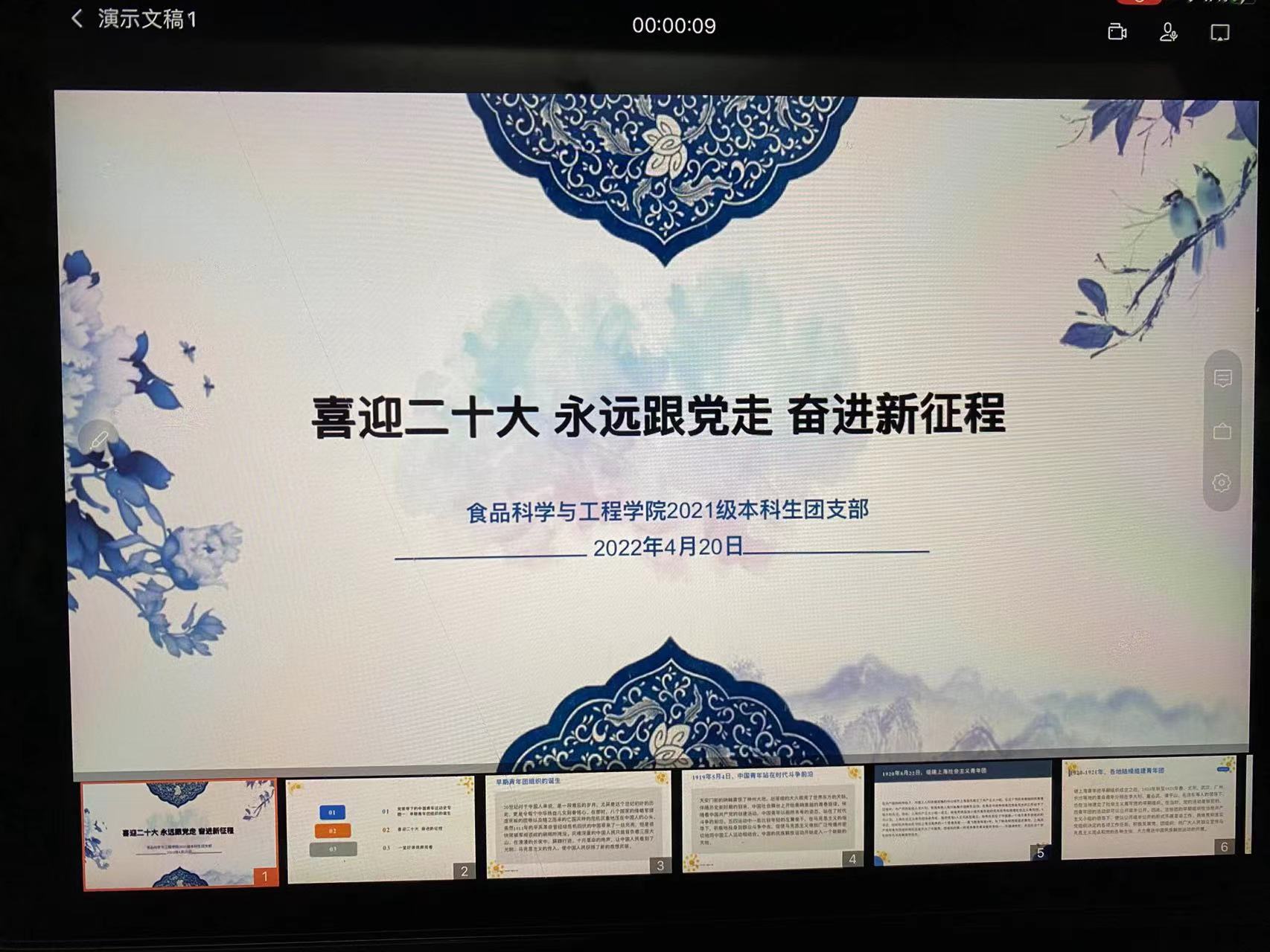 为迎接党的二十大胜利召开,隆重庆祝建团100周年,食品科学与工程学院2021级本科生团支部于2022年4月召开了“喜迎二十大、永远跟党走、奋进新征程”主题教育活动。本次活动由赵明威主持。