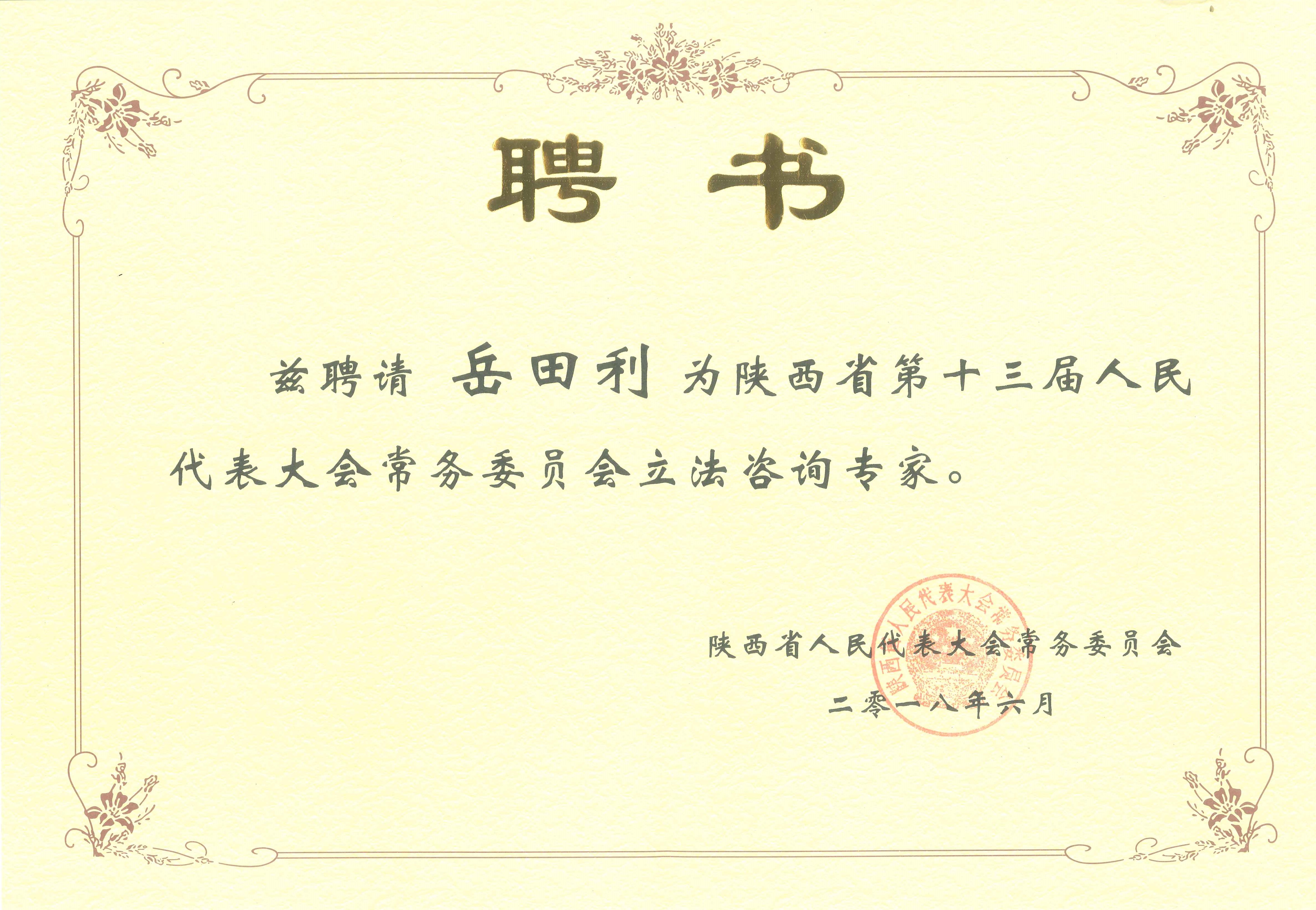 岳田利教授省第十三届人大常委会立法咨询专家聘书
