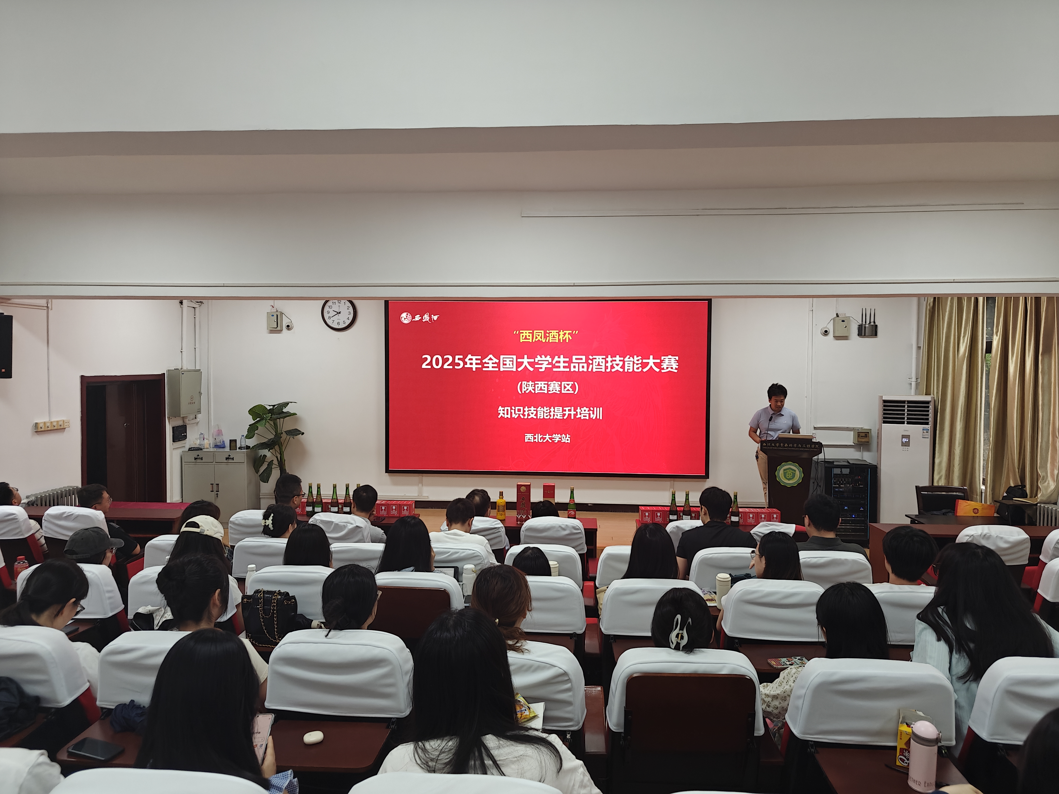 5月30日,“西凤酒杯”2025年全国大学生品酒技能大赛(陕西赛区)知识技能提升培训在西北大学太白校区食品科学与工程学院举行。西凤酒酒体设计中心主任陈君平,副主任林克明、祁耀华,beat365在线体育官网行政副院长马燕及相关师生共百余人参与本次培训,会议由冯克伟副教授主持。