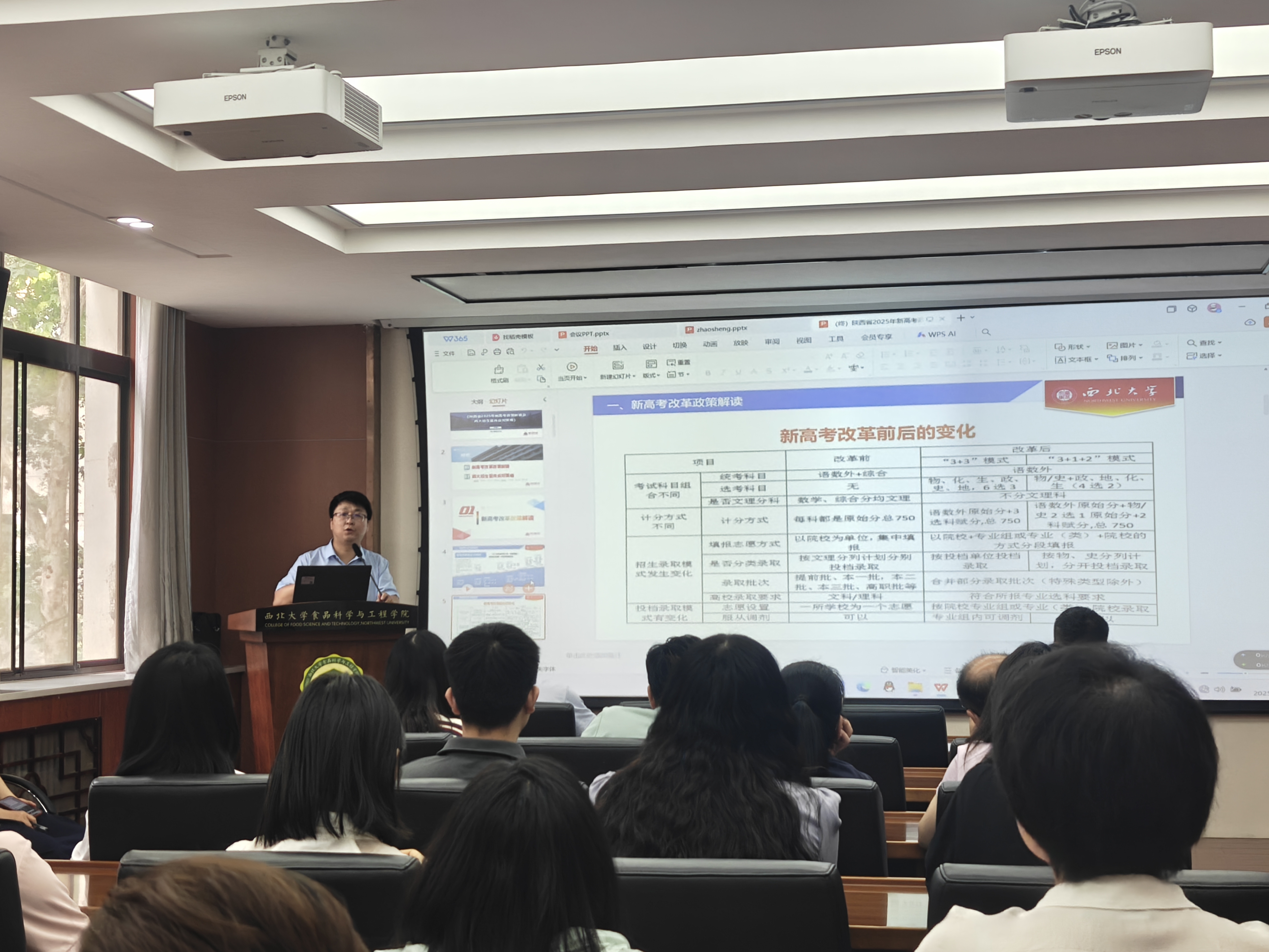 在解读西北大学招生政策环节,郑战伟主任详细介绍了学校 2025 年的招生计划、专业设置以及录取规则。着重讲解了平行志愿的投档原则以及学校在专业录取时对考生成绩、单科成绩和体检情况的具体要求,让教职工们对招生录取流程有了清晰的认识。